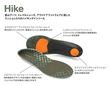 Hike Cushionは、軽量構造のサポートと特許取得済みの Adaptive Comfort Technology™ が足の自然な動きに柔軟に適応し、エネルギーを与えるヒールクッションが衝撃を分散して疲労を軽減します。