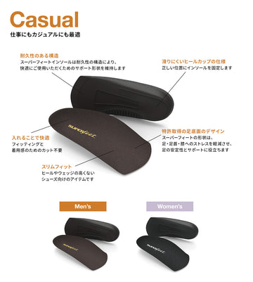 中敷きのとれないビジネスシューズや薄手のカジュアルシューズのつま先側を圧迫することなく快適な履き心地を感じさせる設計になっています。
